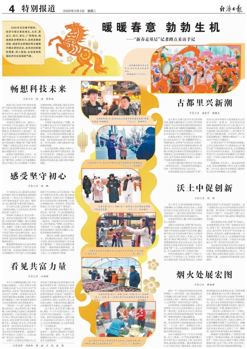 2026年农历春节期间,经济日报记者赴湖北、北京、黑龙江、四川、浙江、广西等地,围绕激勉耗尽新活力、培育发展新动能、增进民生新福祉等主题张开蹲点调研采访,在浓浓的新春氛围里,深入报说念、灵活呈现我国经济社会发展新气候。