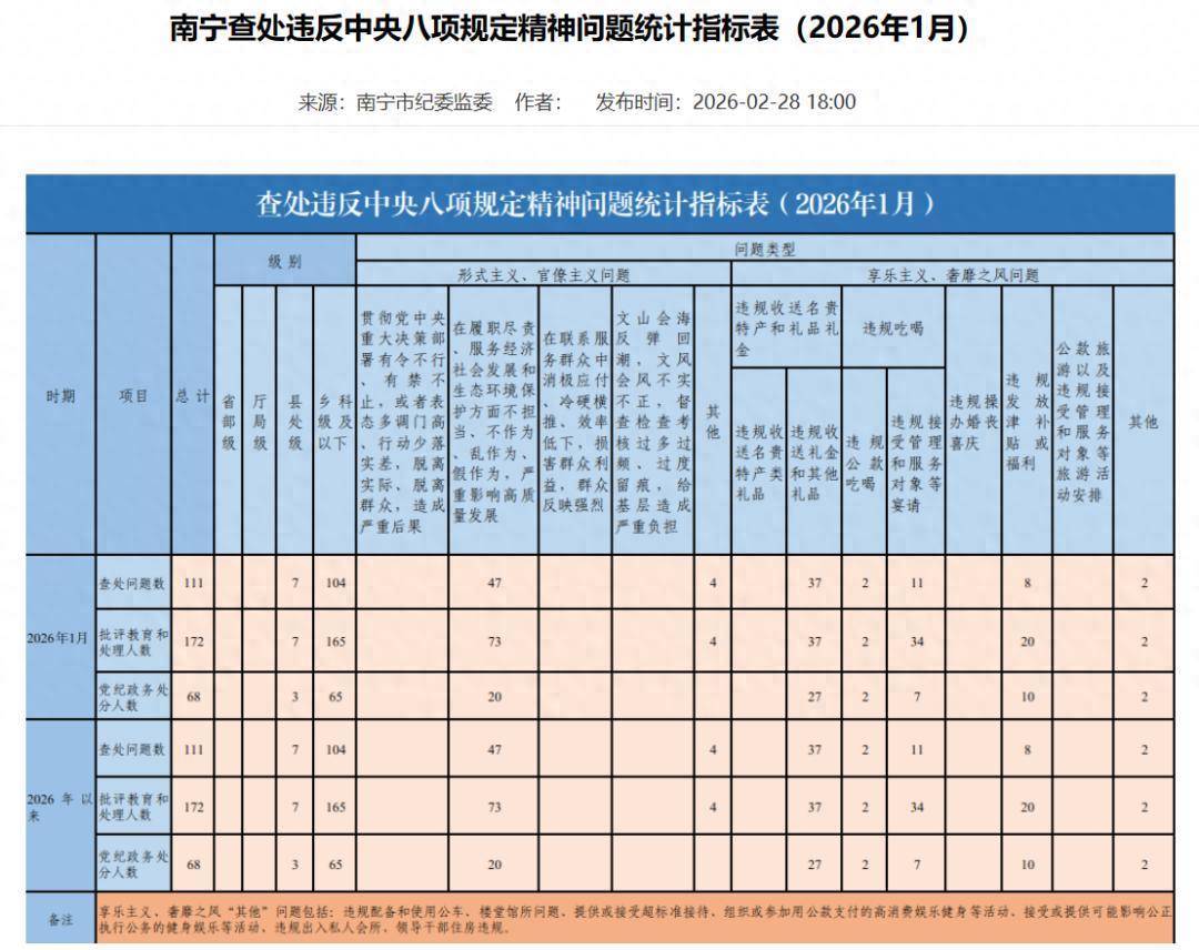 近日,南宁市纪委监委公布了2026年1月南宁查处违背中央八项设施精神问题汇总情况。2026年1月,南宁共查处违背中央八项设施精神问题111起股票配资在线,永华证券,永华证券配资,香港永华证券公司品评训诲和贬责172东谈主,其中党纪政务刑事牵扯68东谈主。